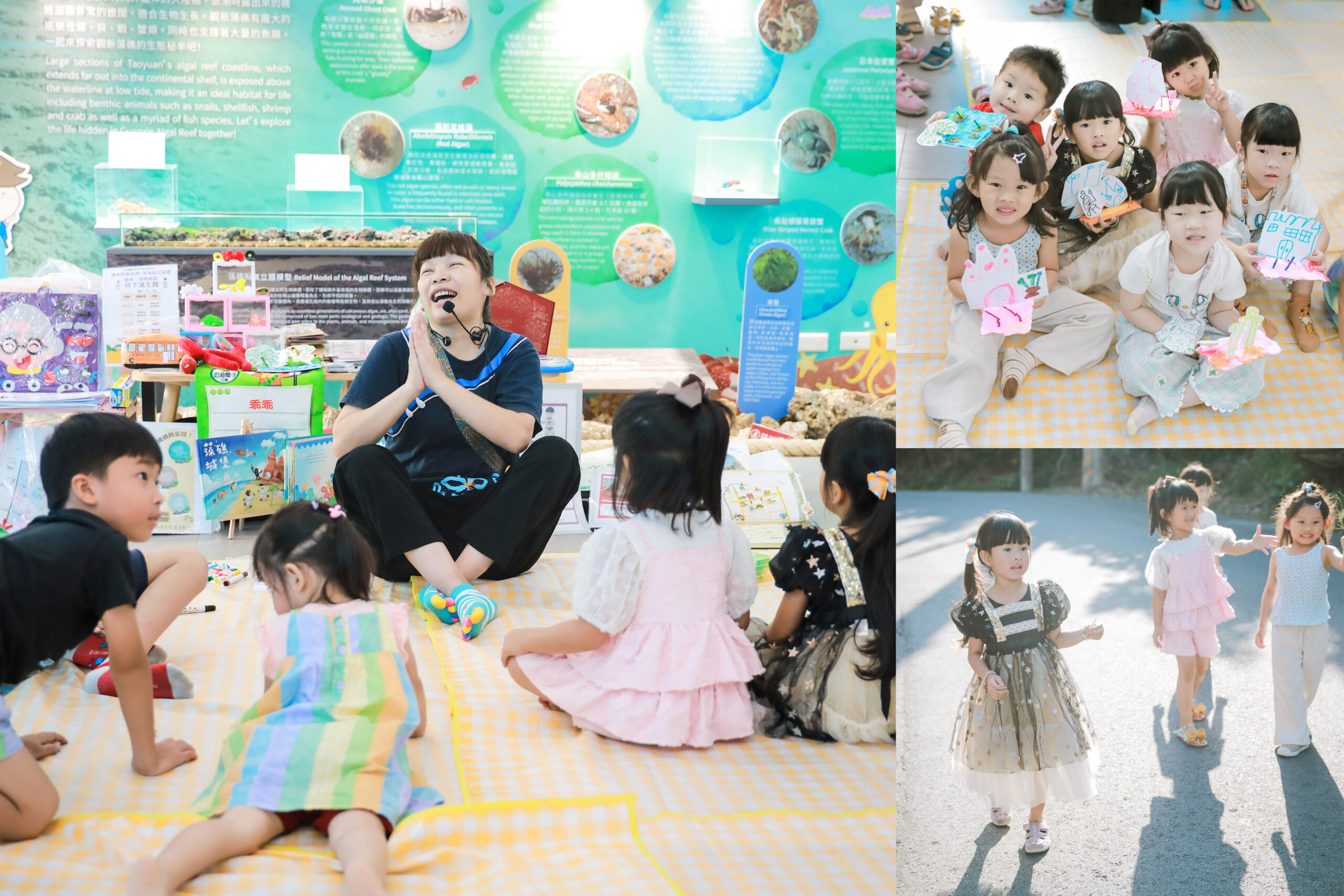 活動一開始,布丁老師用一本結合環境與海洋的小繪本開場,帶孩子們進入故事世界。過程中穿插了客家話教學,像是「藻礁」、「招潮蟹」、「彈塗魚」等等,讓語言與環境互動得很自然。